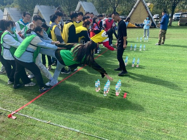 第一个项目是群龙取水。这个游戏需要团队成员相互配合、合理分工,要求所有队员在规定线之外每人依次取得一瓶水。在此项目中,各个队员需要相信并保护同伴,根据身高体型选择最佳取水顺序。经过这轮游戏的合作配合,不熟悉的队员之间建立起了信任与默契,学会了积极面对压力,通过领导行为塑造个人影响力。
