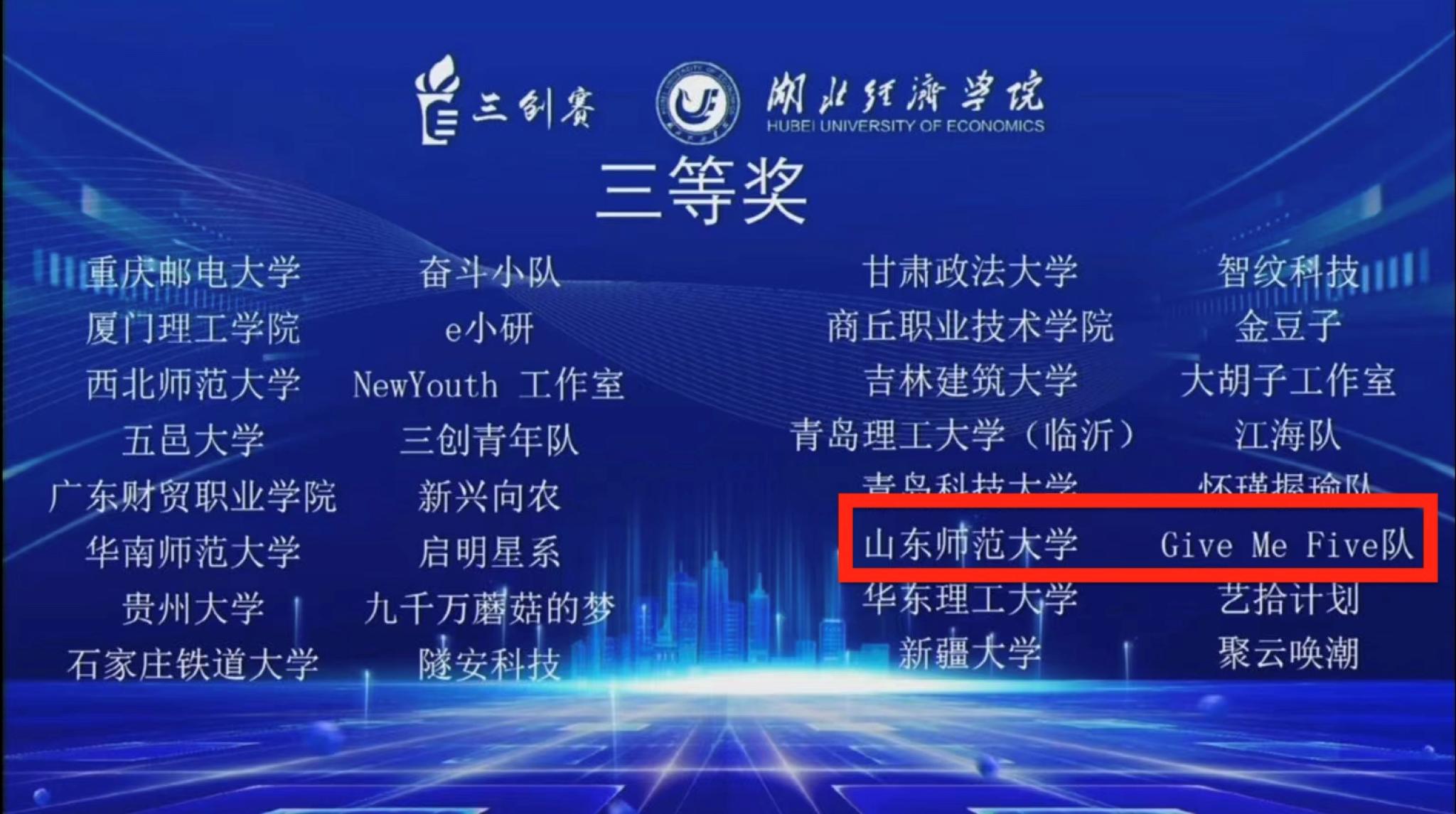 7月22-24日,第十二届全国大学生电子商务“创新、创意及创业”挑战赛(以下简称三创赛)总决赛在湖北经济学院圆满落下帷幕。我院孙曙光老师指导的Give Me Five队“三只小猪”家装APP项目喜获国家级三等奖。